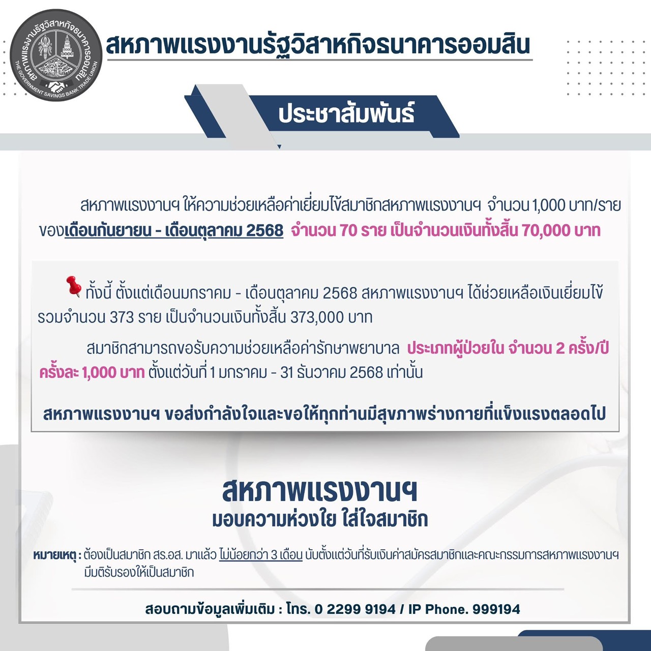 Posted inประกาศ/ข่าว สร.อส. สหภาพแรงงานฯ ให้ความช่วยเหลือค่าเยี่ยมไข้แก่สมาชิกฯ ของเดือนกันยายน – ตุลาคม 2568 Posted by สหภาพแรงงานรัฐวิสาหกิจธนาคารออมสิน 04/11/2025
